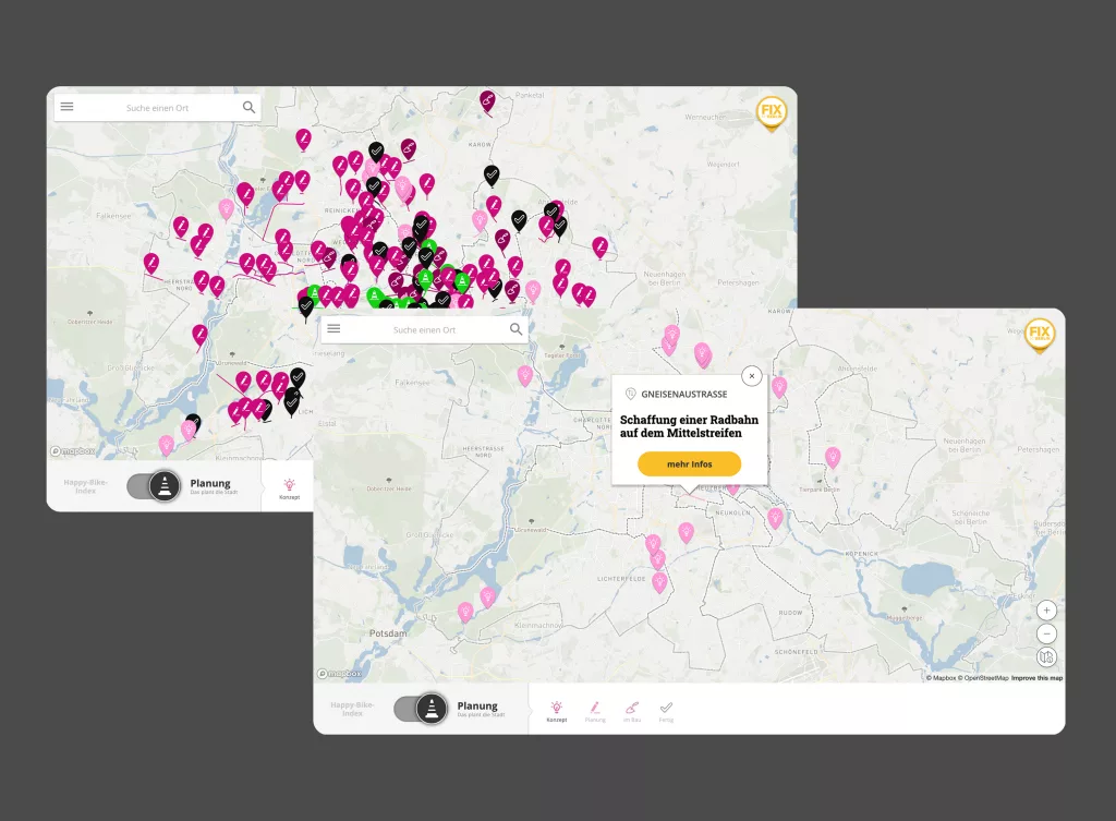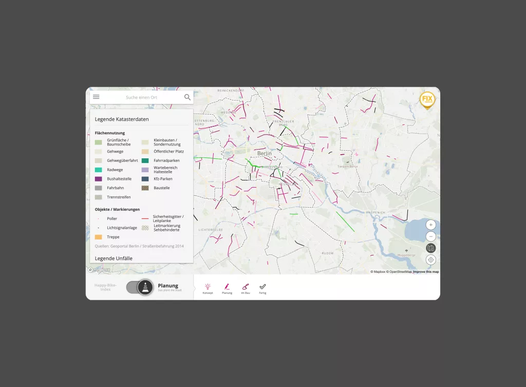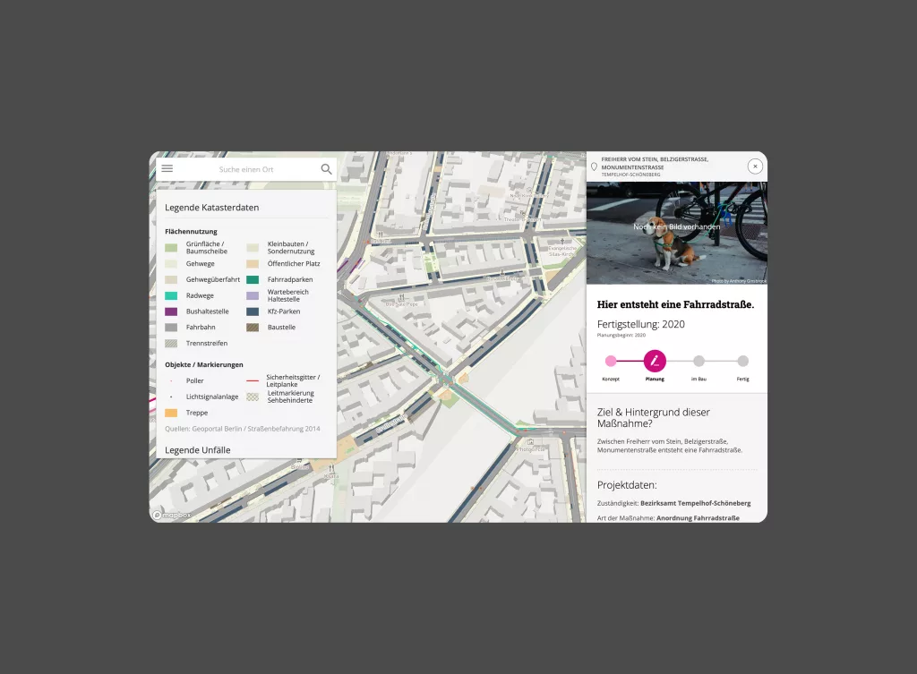 Gefördert durch das Bundesministerium für Verkehr und in Kooperation mit dem Land Berlin haben wir eine zentrale Planungsplattform entwickelt, auf der 238 Planungen aus allen 12 Bezirksämtern transparent und verständlich dargestellt werden. Die Online-Karte macht Fortschritte beim Ausbau der Radinfrastruktur sichtbar und schafft Akzeptanz bei Bürger:innen, indem sie den Planungsprozess nachvollziehbar macht.