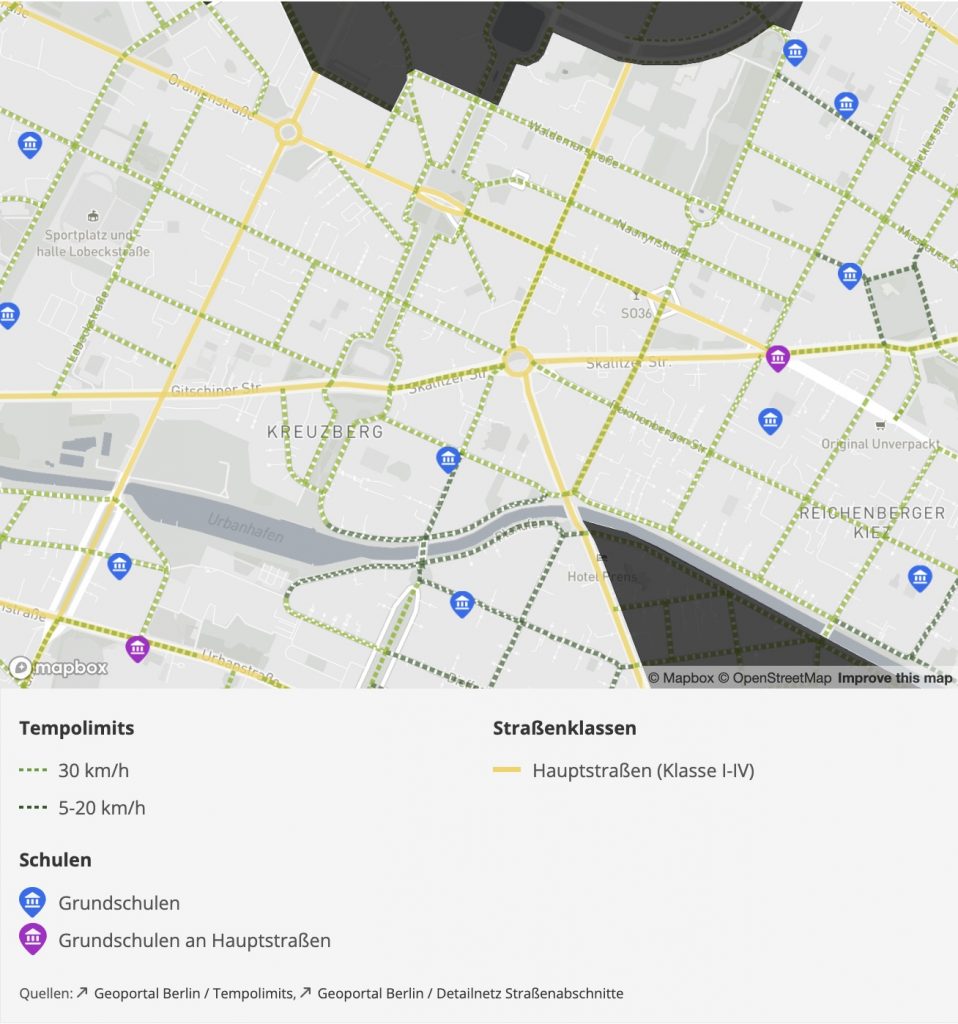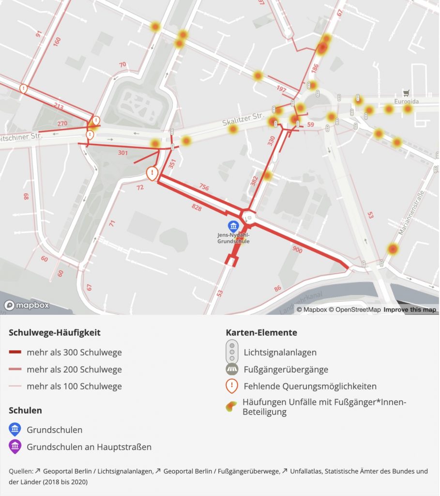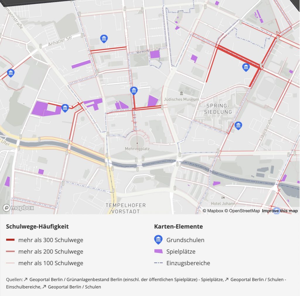 Auf einer Projektwebsite wurden die Daten interaktiv mit weiteren Daten wie Unfallzahlen und Querungsmöglichkeiten visualisiert. In einem weiteren Schritt wurde eine Auswertung zu möglichen fehlenden Querungen erstellt. Dazu wurden Knotenpunkte ohne Querung, aber mit hoher Schulwegezahl ausgewertet.