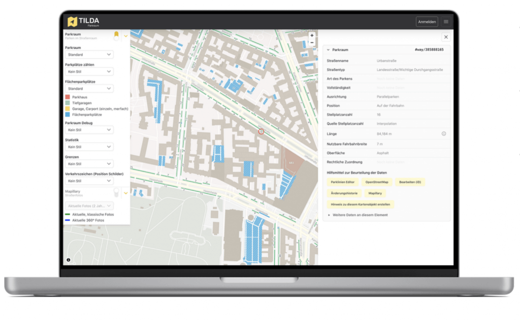 Erleben Sie, wie TILDA Parkraum Kommunen ermöglicht, Parkflächen präzise zu erfassen, Änderungen schnell umzusetzen und Verwaltungsprozesse deutlich zu vereinfachen. Schauen Sie sich unser Beispielprojekt an!